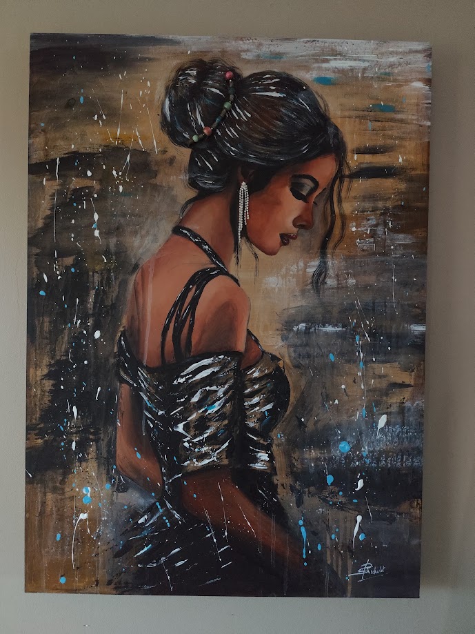 Oeuvre peinte sur bois . Acrylique et collages de bijoux et vernis brillant. Seul le visage est réaliste pour que l’on s’y attarde plus intensément et le fond est quand à lui très abstrait, l’effet bois est laissé très apparent.