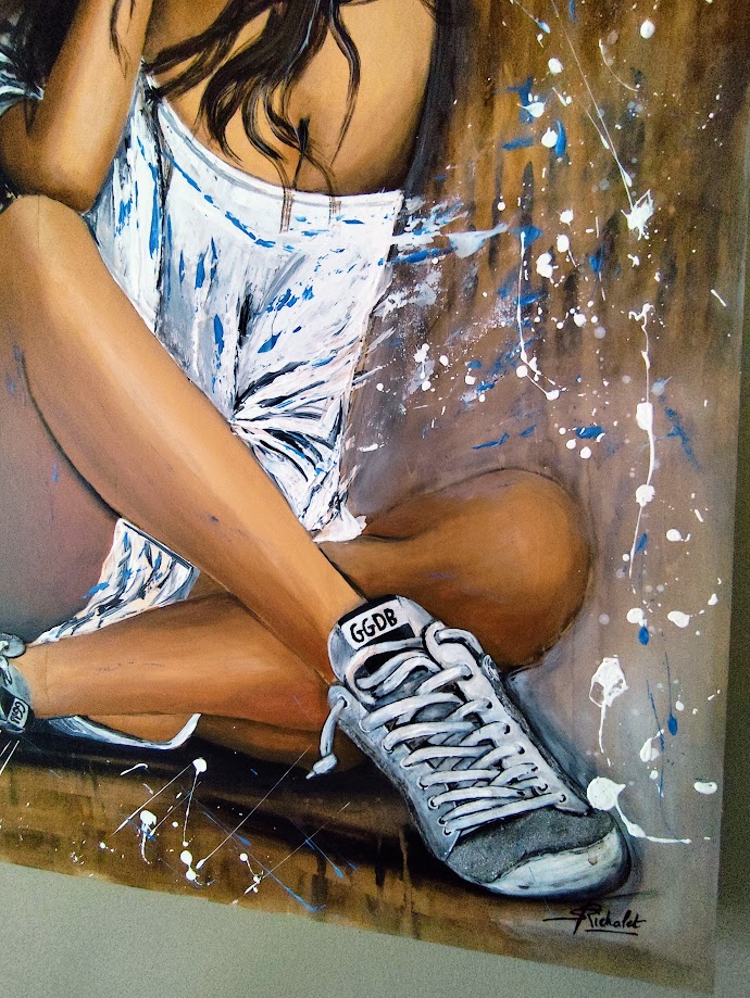 - Travail au couteau pour donner de la texture, effet aquarelle pour le fond, éclaboussures pour donner de la modernité.
