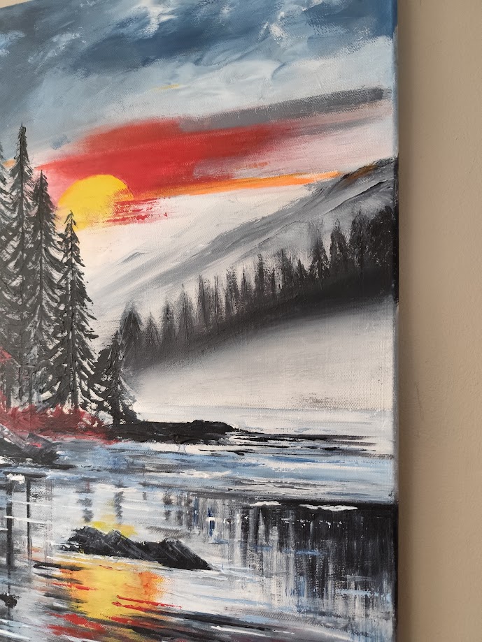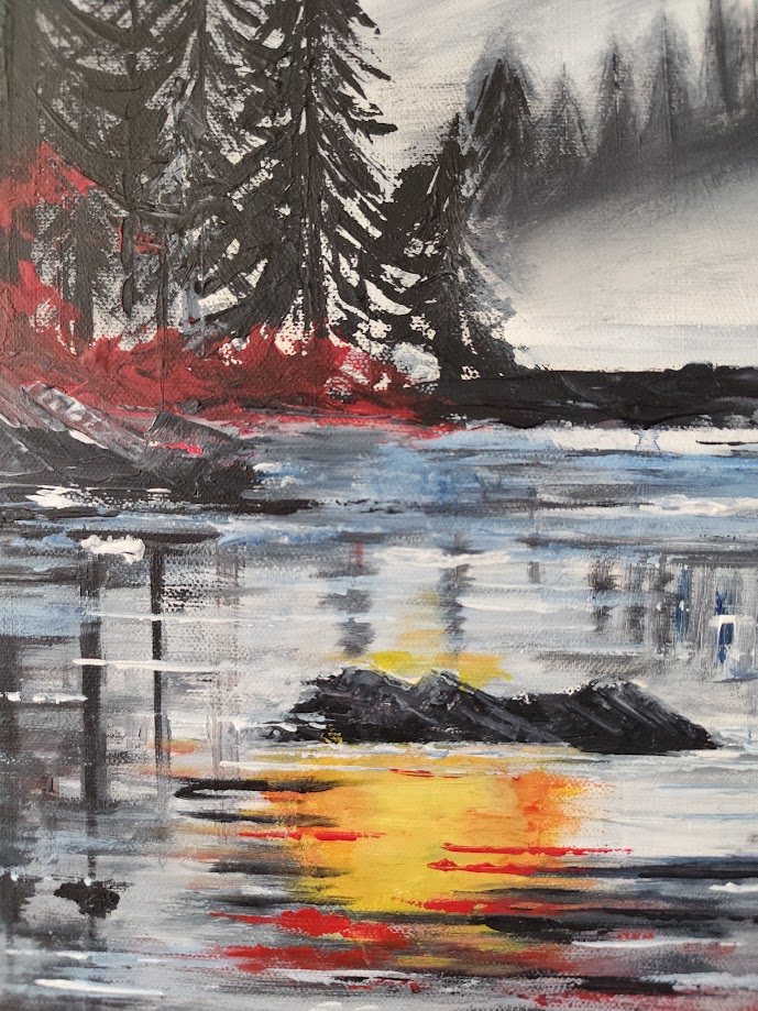 Grandeur 38 sur 46 cm, acrylique sur toile coton, livrée prête à être accrochée.