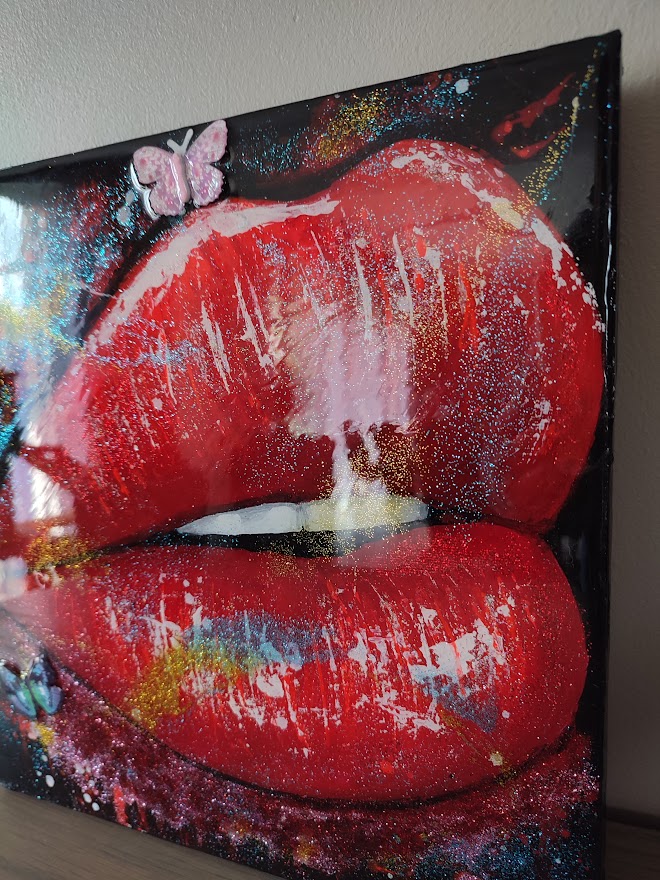 Oeuvre acrylique avec résine époxy , paillettes et collages, 30 sur 30 cm et 4 cm de large.