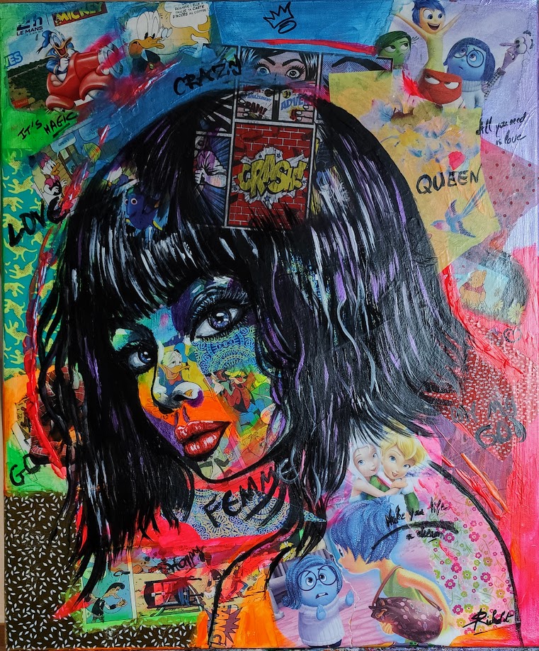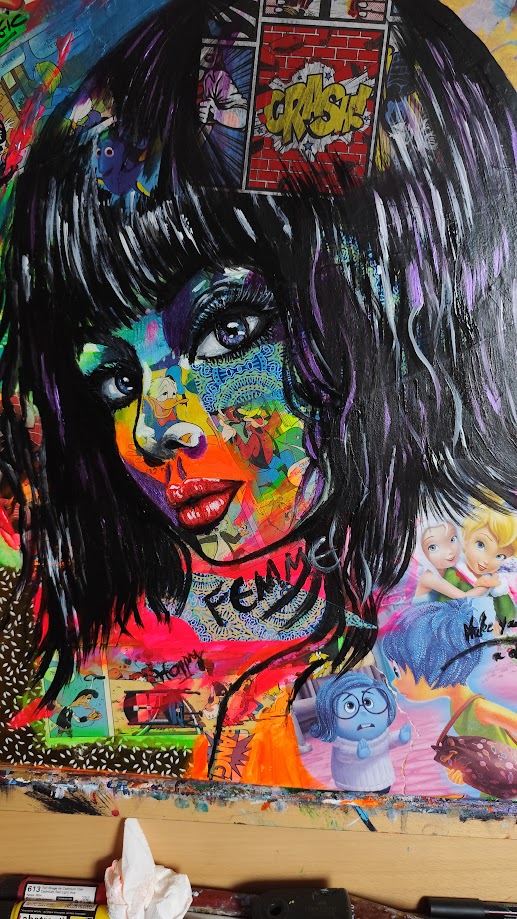 - Oeuvre très popart avec des collages et des couleurs fluo. Le personnage est peint à la main à l’acrylique, la toile est vernis.
