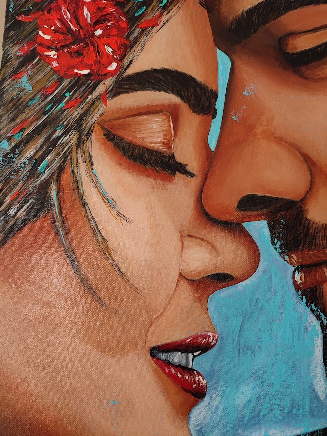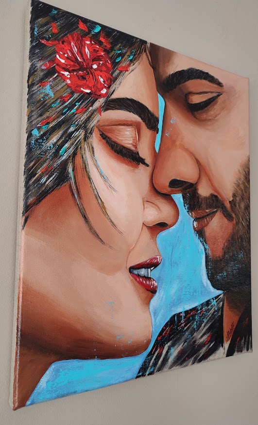 Couple sur toile de lin brut, de 46 sur 38 cm, prête à être installée au mur.