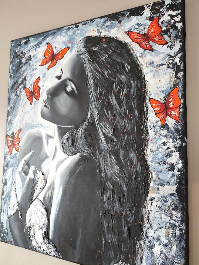 Oeuvre acrylique sur toile de lin en noir et blanc et des touches de orange , des papillons, de dimensions 60 sur 73 cm.
